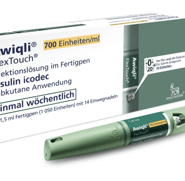 •Presentación y dosificación: La insulina icodec viene en una pluma precargada llamada FlexTouch. La concentración de la insulina es U700/ml, lo que significa que el volumen de inyección es similar al de las insulinas diarias, a pesar de que la dosis total semanal es mayor. Las dosis se ajustan en la pluma en unidades por semana, en pasos de 10 unidades, con un máximo de 700 unidades.